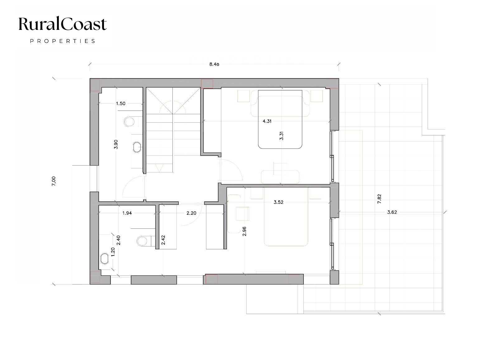 Das Haus verteilt sich auf drei Etagen mit einem Design, das den Lichteinfall maximiert. Im Inneren erwarten Sie 3 geräumige Schlafzimmer und 3 komplette Bäder, alle mit modernen Ausstattungen und hochwertigen Materialien. Das Hauptwohnzimmer mit großen Fenstern öffnet sich zum privaten Garten und verbindet Innen- und Außenbereiche perfekt.