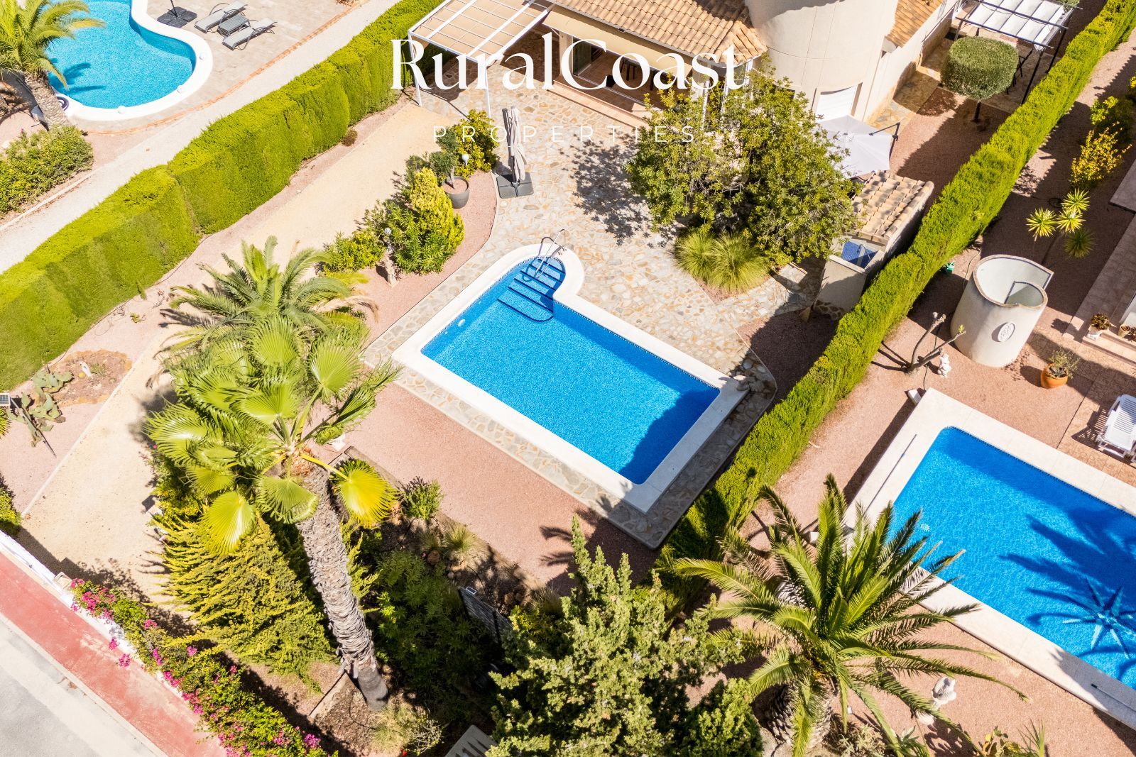 Outdoors, the villa is surrounded by a carefully maintained setting. Its fantastic private swimming pool stands out, ideal for cooling off on sunny days and fully enjoying the privileged Costa Blanca climate. The garden, adorned with mature trees and colourful Mediterranean plants, creates a relaxing and vibrant atmosphere, perfect for unwinding and spending time outdoors.