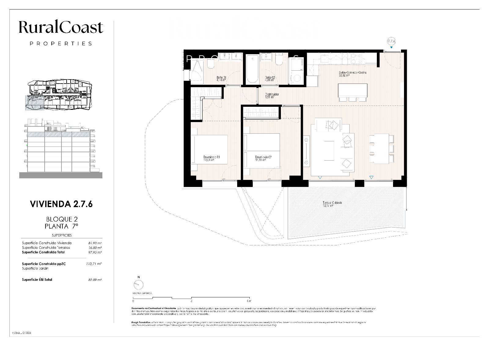 Con una superficie construida total de 97,93 m², 82,09 m² útiles y una terraza cubierta de 16,00 m², la vivienda combina amplitud, confort y luminosidad en cada estancia.