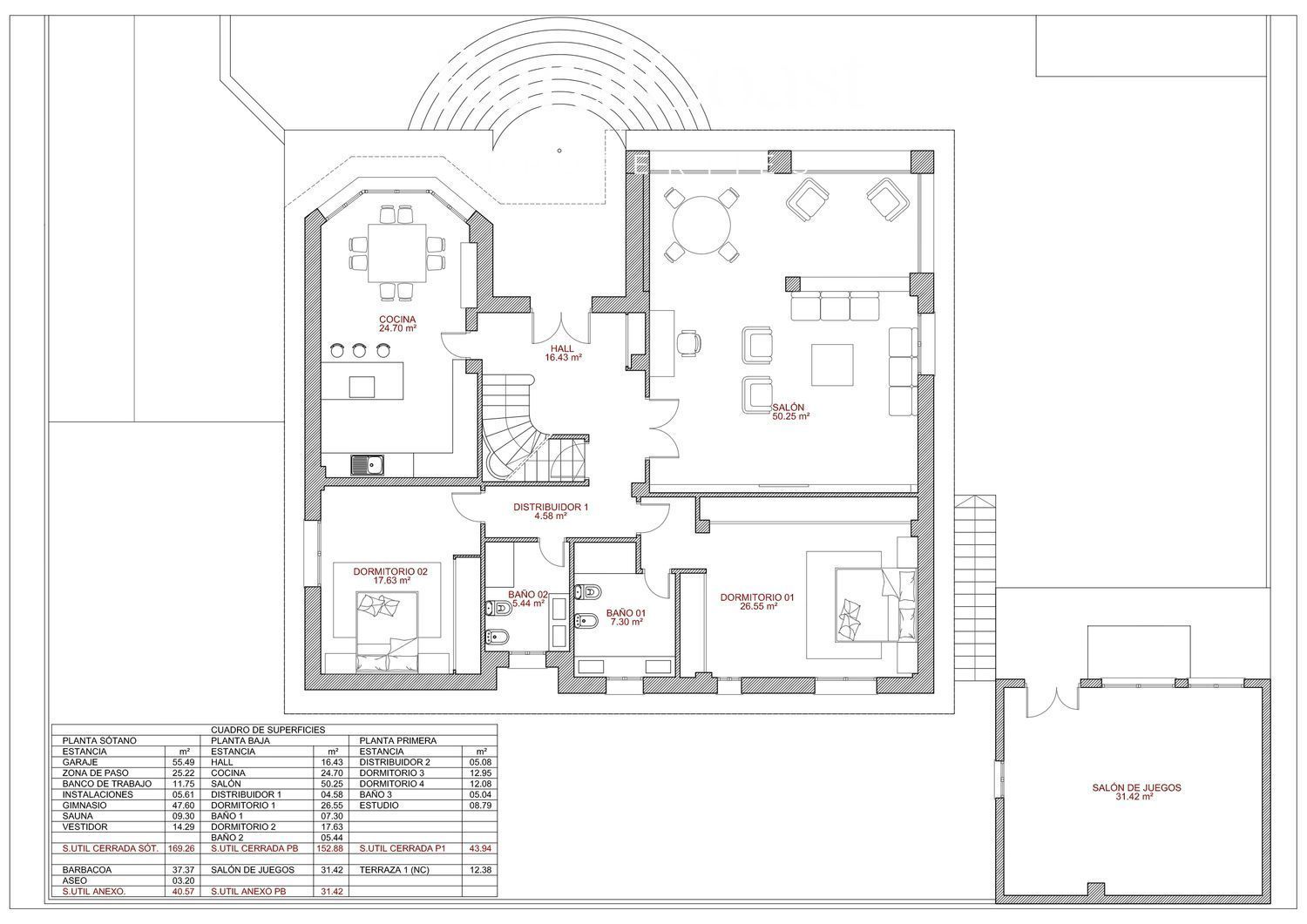 En la planta sótano (165 m²) encontramos un gran garaje con capacidad para cuatro coches, gimnasio privado, sauna, zona de trabajo y vestidor.