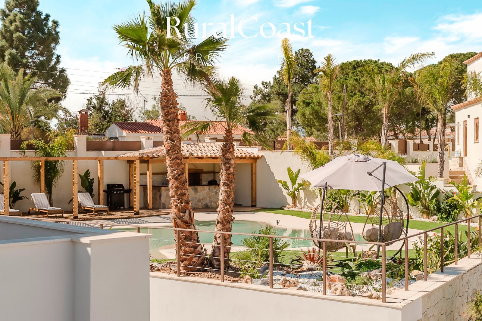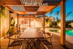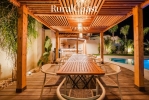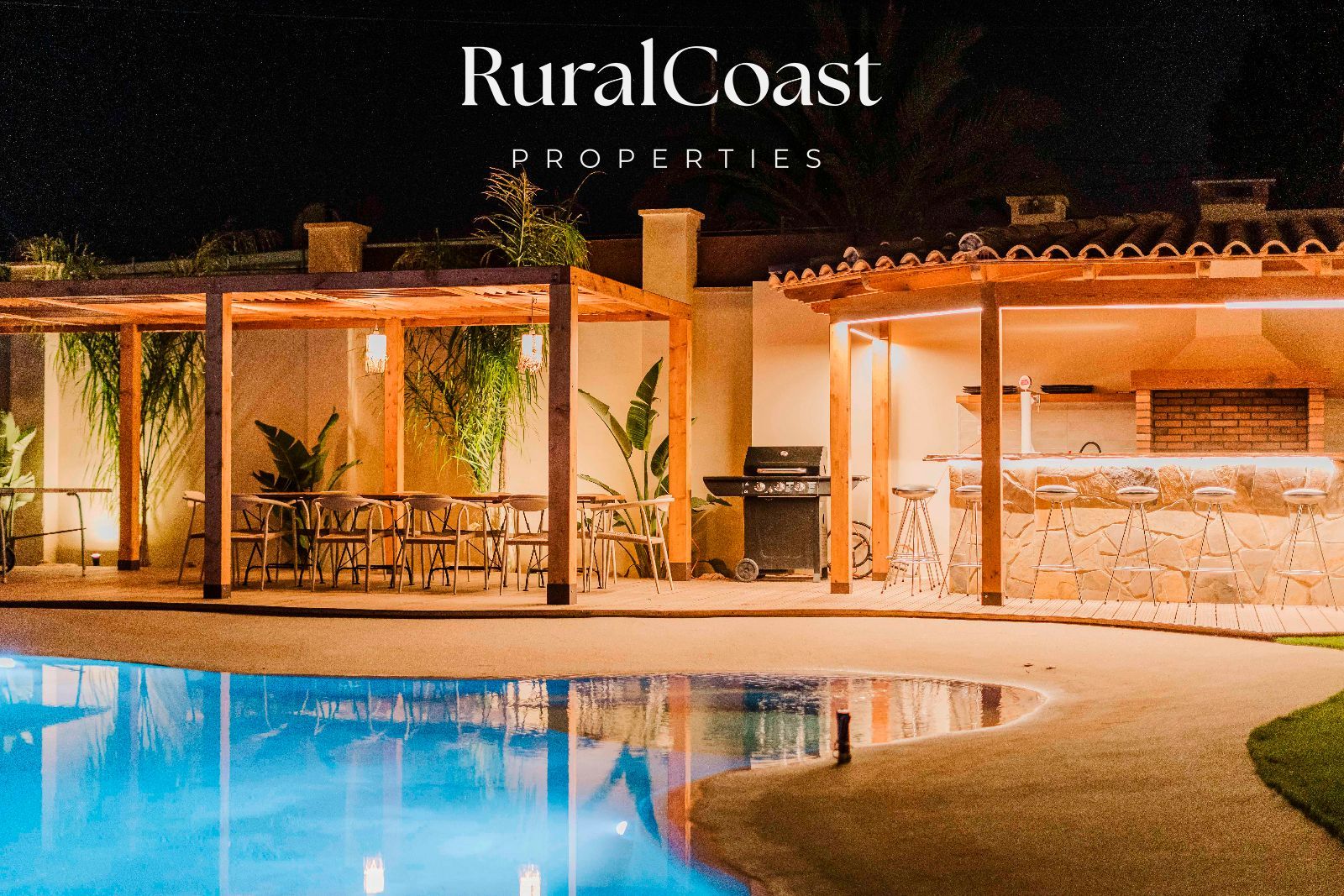 El exterior es un auténtico paraíso: una piscina tropical, jacuzzi para 8 personas, bar al aire libre con barbacoa y grifo de cerveza, y diversas zonas de descanso donde disfrutar del sol o de una velada bajo las estrellas. Por la noche, la iluminación ambiental transforma la villa en un escenario mágico de luces y colores.