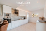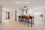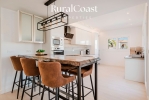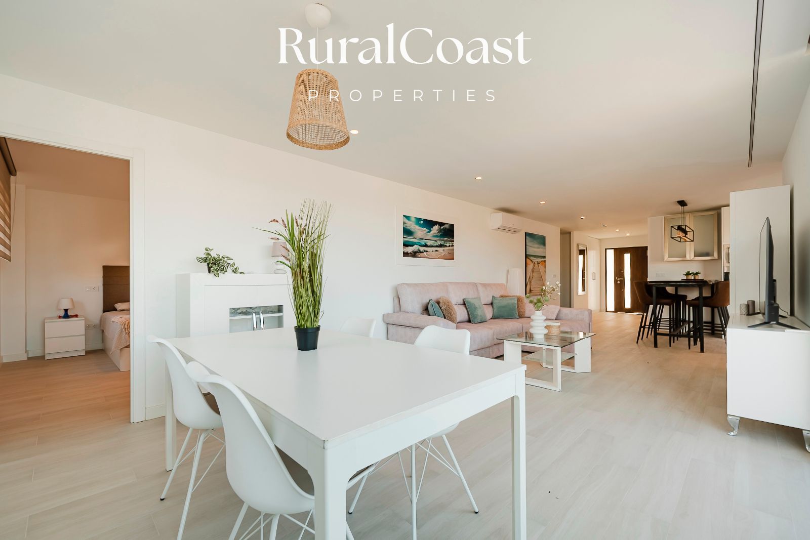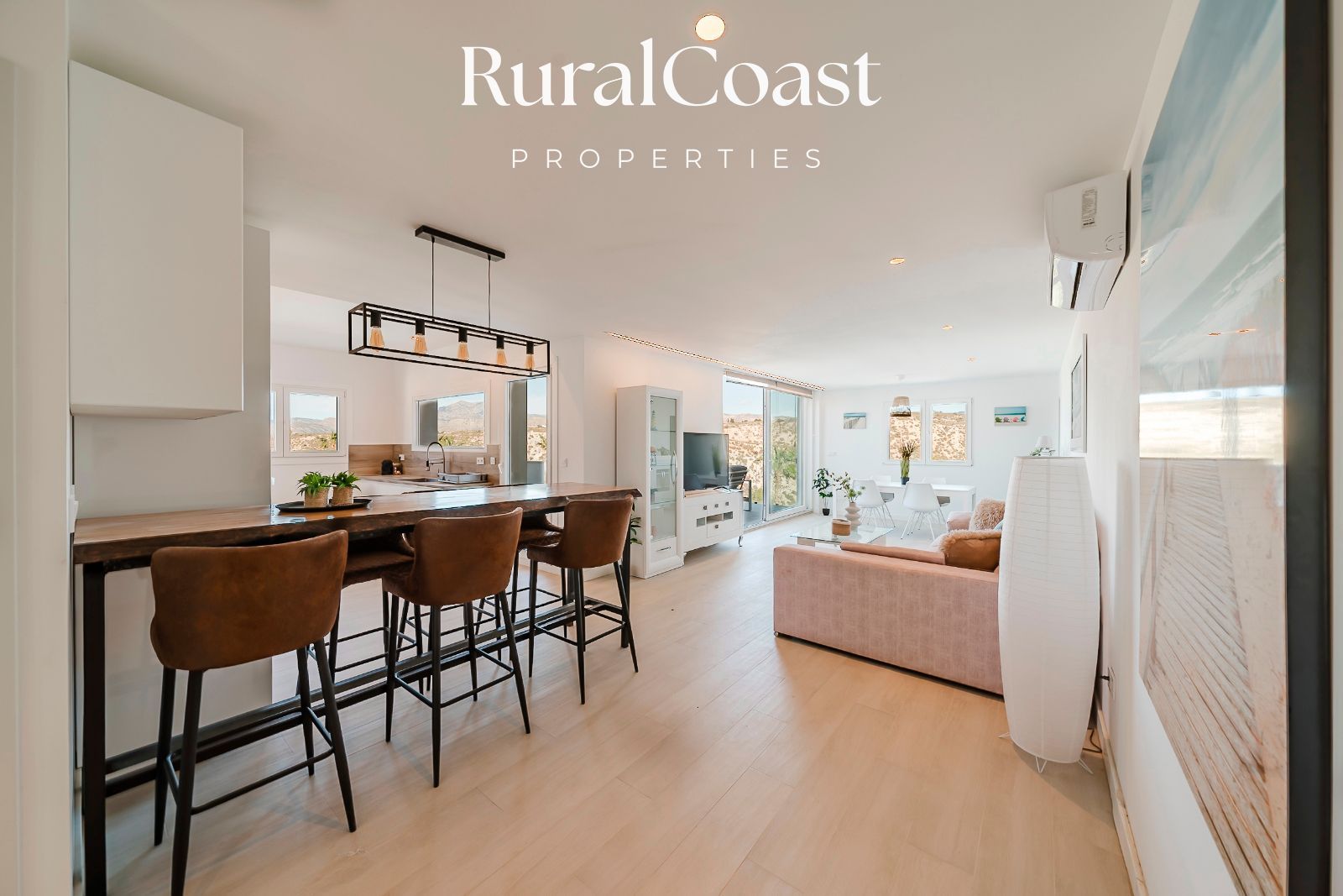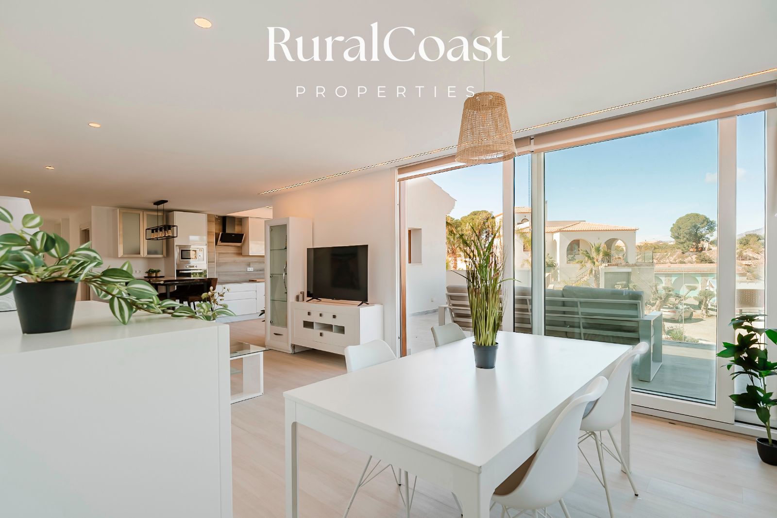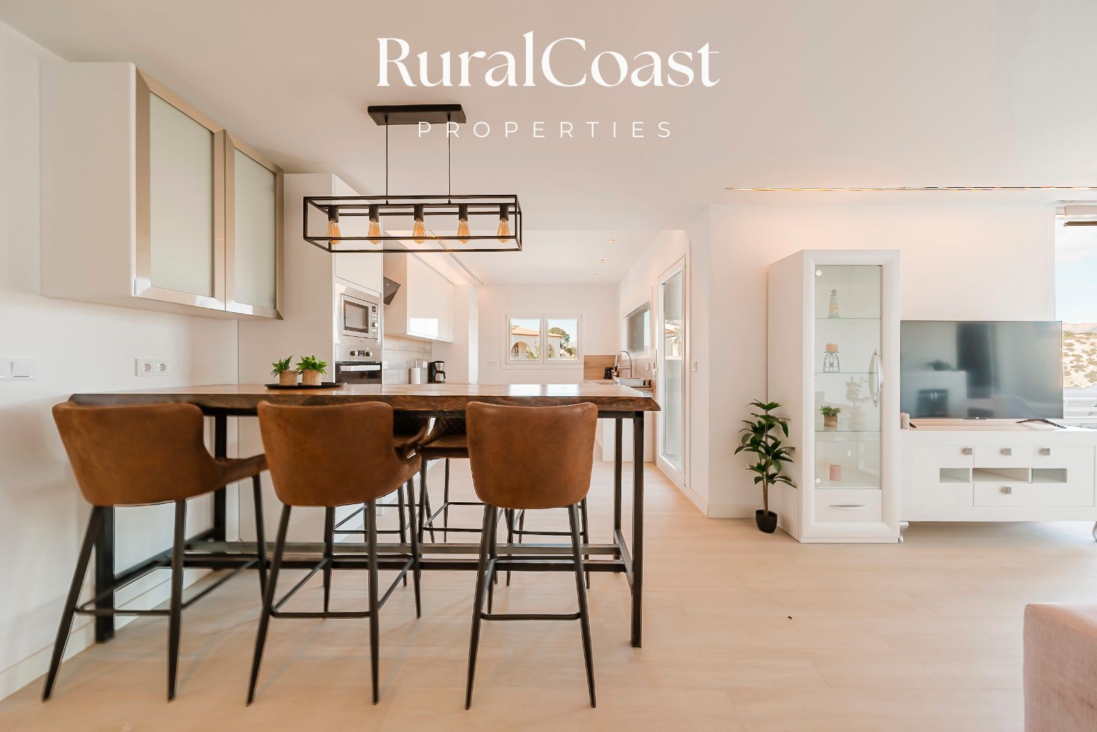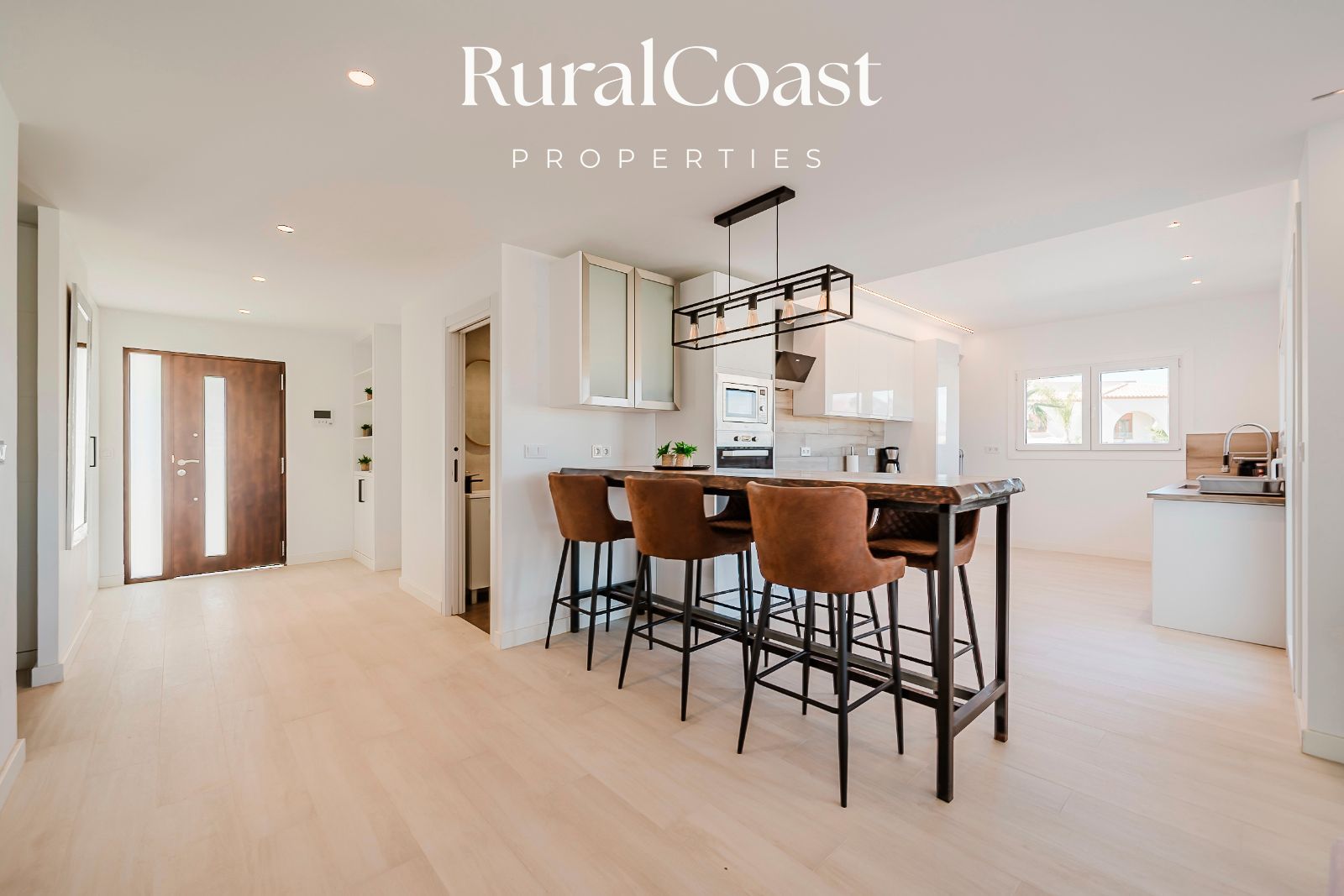 El amplio salón con grandes ventanales permite disfrutar de la luz natural durante todo el día y conecta directamente con la terraza y la zona exterior. La cocina moderna y totalmente equipada está pensada para quienes disfrutan de la gastronomía y el encuentro social.