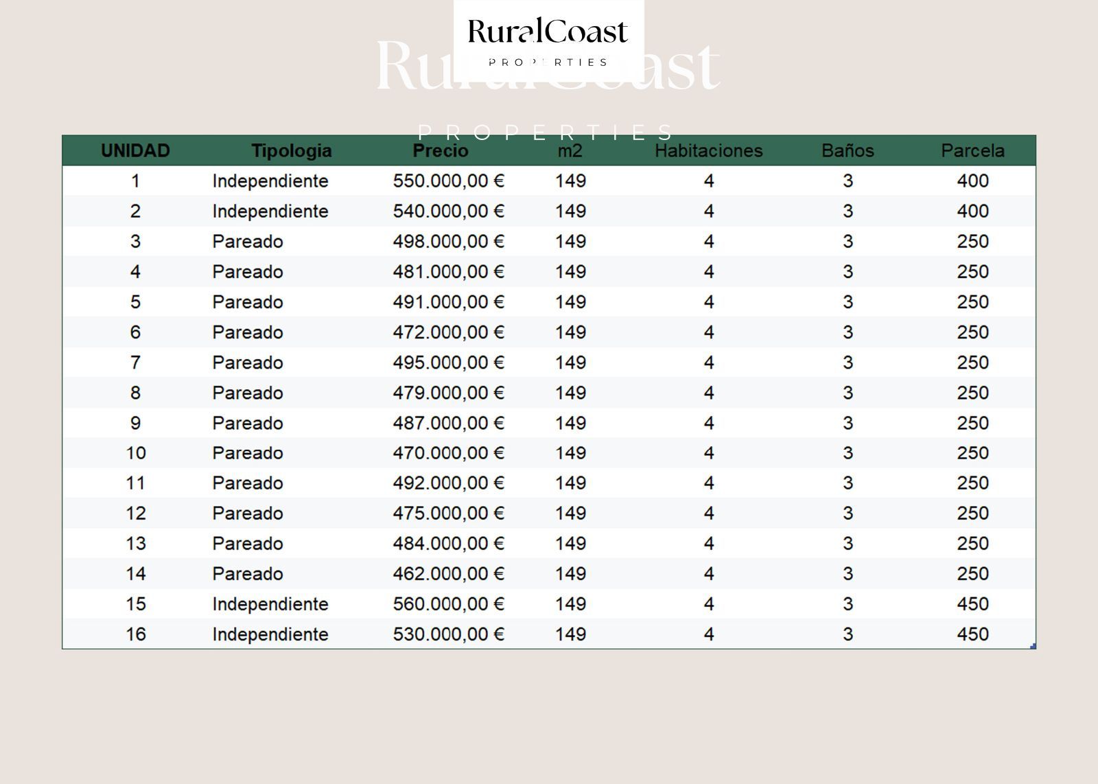 La promoción consta de 16 viviendas unifamiliares —12 pareadas y 4 aisladas— con parcelas privadas de entre 250 m² y 450 m², precios desde 462.000 €, y la posibilidad de añadir piscina privada y planta sótano.
