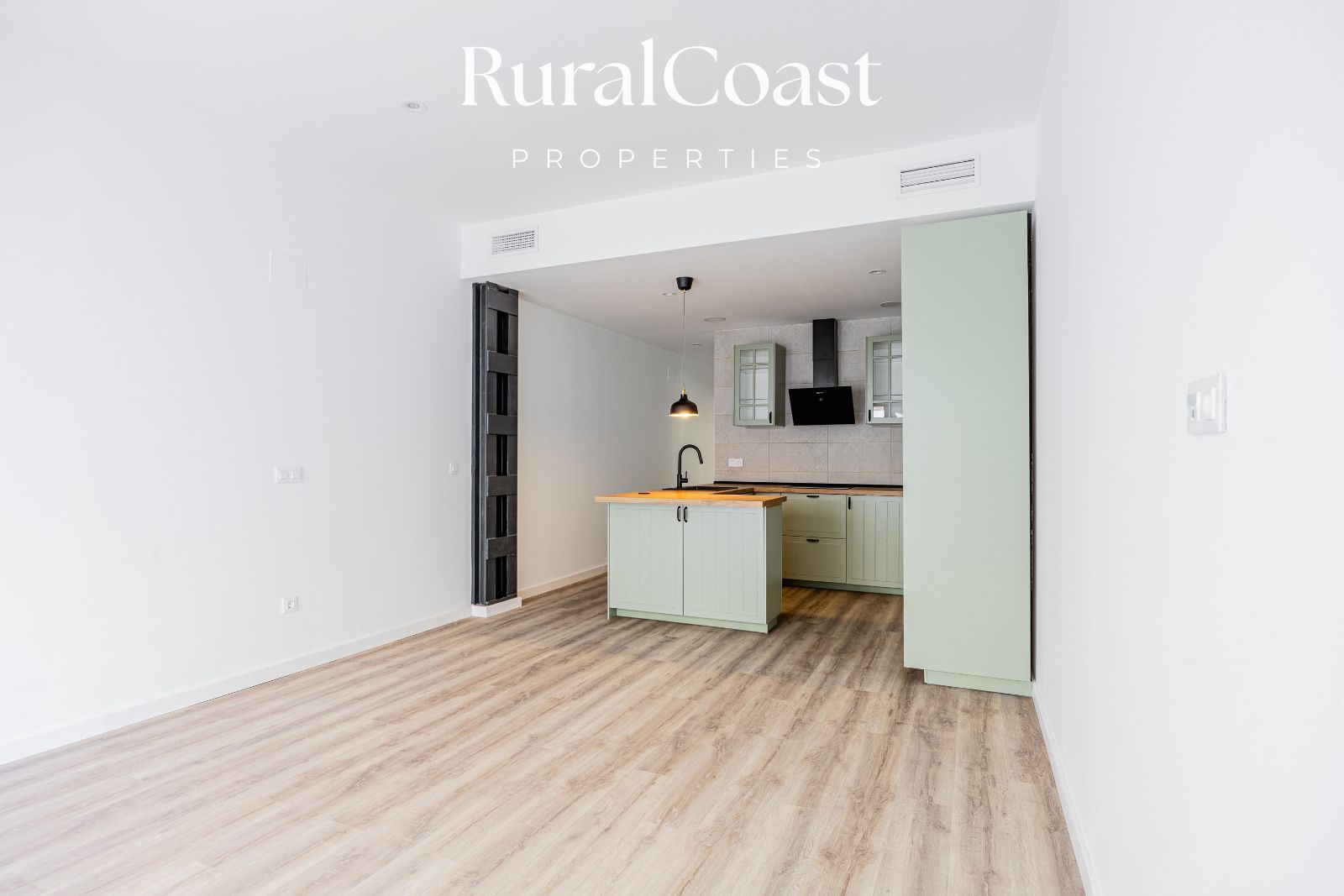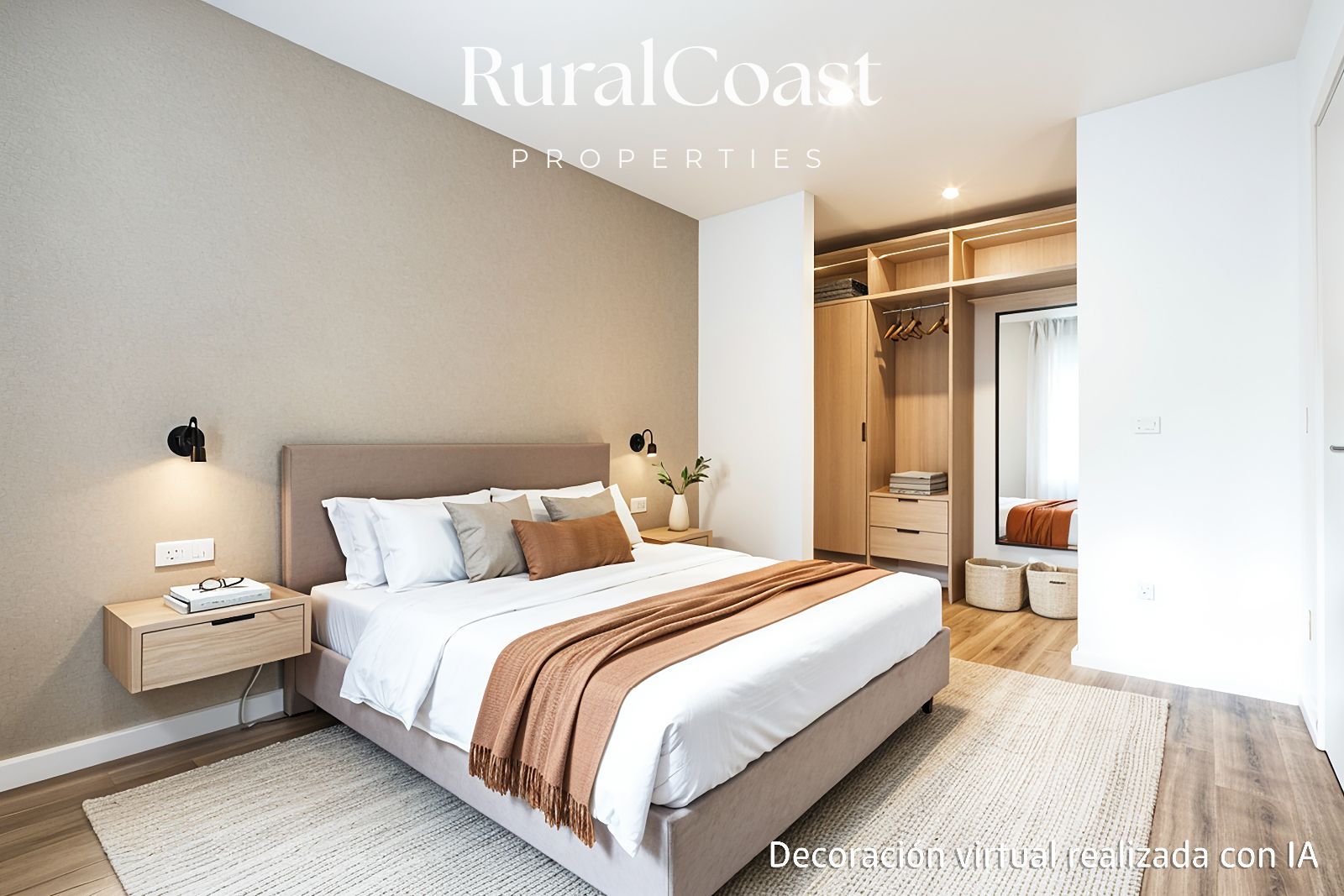 La vivienda ofrece un luminoso dormitorio principal con espacio para vestidor, un baño completo con ducha, y un salón-comedor de concepto abierto con cocina americana totalmente equipada, diseñado para aprovechar al máximo la luz natural.