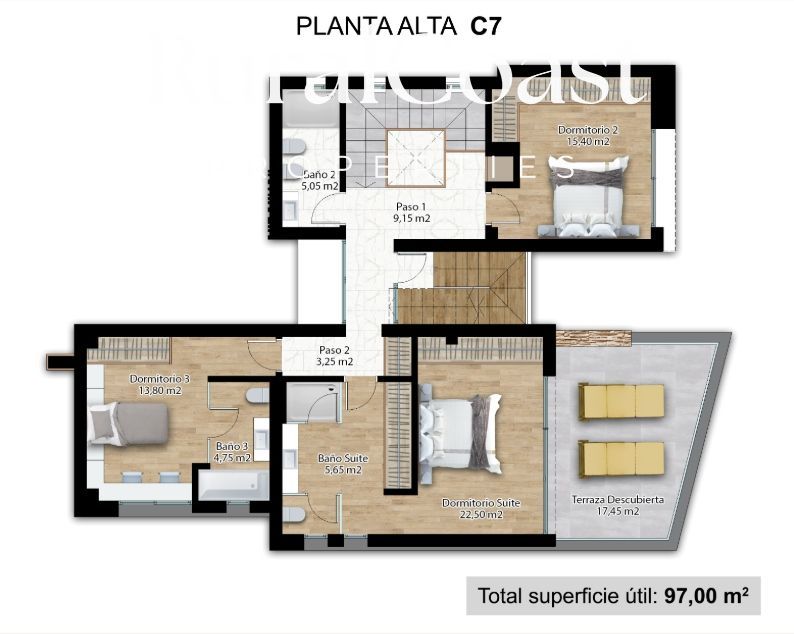 ✅ Eerste verdieping: Drie tweepersoonsslaapkamers en drie badkamers (twee en suite). De master bedroom beschikt over een exclusief privéterras van 19 m².