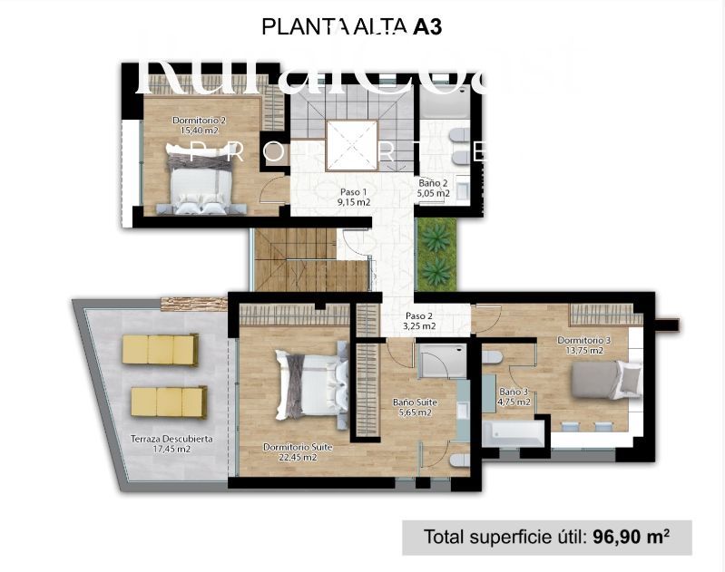 ✅ Eerste verdieping: Drie tweepersoonsslaapkamers en drie badkamers (twee en suite). De master bedroom beschikt over een exclusief privéterras van 19 m².
