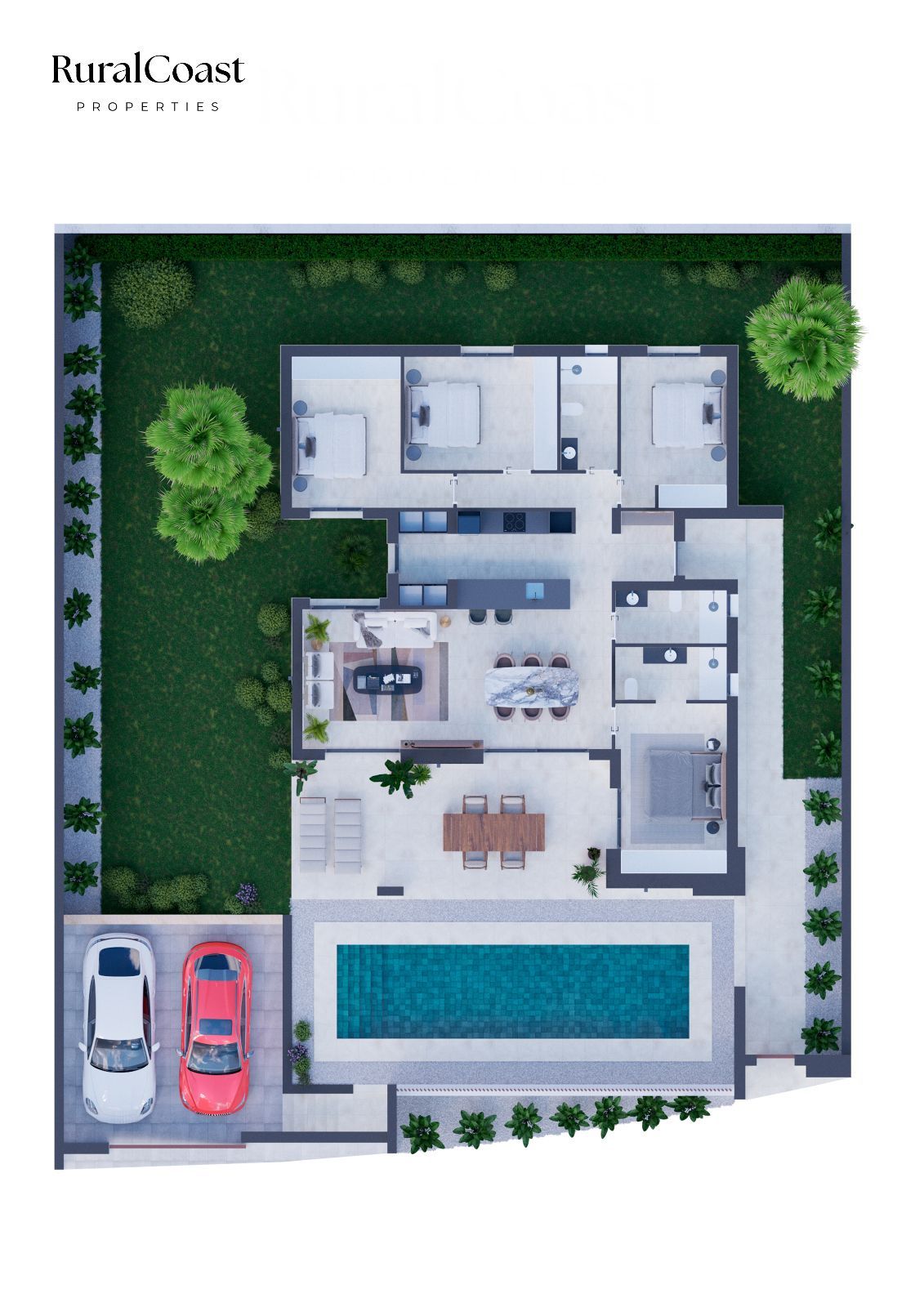 Het huis heeft een dubbele eigen parkeerplaats, 3 slaapkamers (allemaal met eigen badkamer en apart terras - en een van hen met een prachtige kleedkamer-), wasruimte, volledig uitgeruste keuken en een woon-eetkamer met toegang tot een groot terras, waar u een extra groot overloopzwembad en een prachtige tuin vol inheemse soorten kunt vinden.